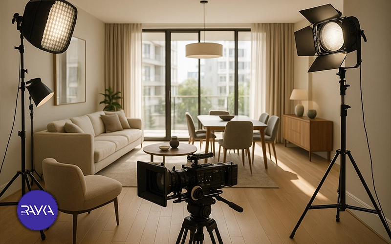نور و چیدمان ملک برای فیلم برداری آماده میشود تا تصاویر جذاب، حرفهای و با کیفیت باشند.