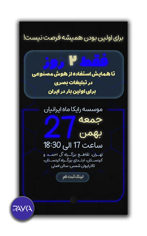 با رعایت اصول طراحی و بهینه سازی، میتوانید کمپینهایی مؤثر و جذاب برای کاربران خود بسازید. در این مسیر، رایکاماه با تجربه و استفاده از تکنولوژیهای نوین، از جمله ساخت تیزر تبلیغاتی با هوش مصنوعی، در کنار شماست تا تبلیغاتی حرفهای و تأثیرگذار بسازید.